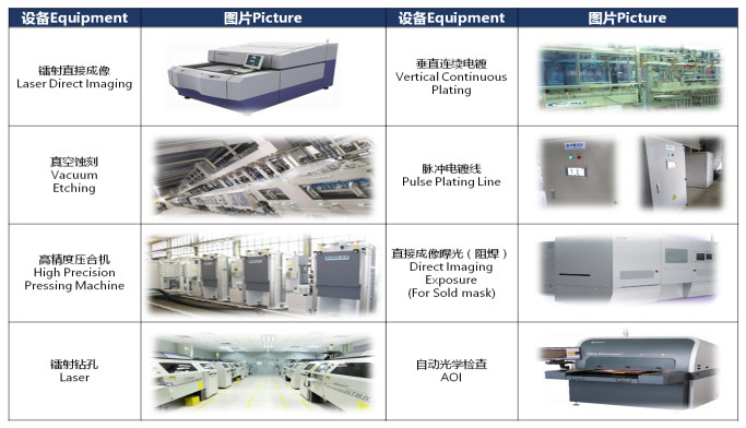 §         设备:压机、镭射五代机、VCP填孔、全制程DI设备、真空蚀刻等业界高端主流设备。