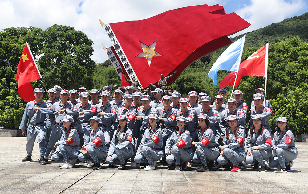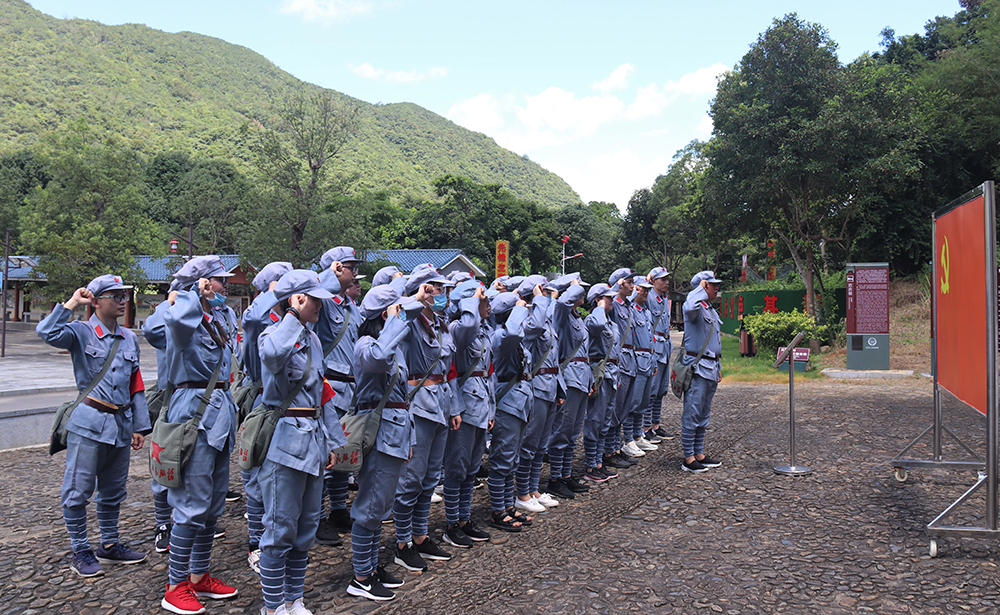 经过3个小时的车程,党员们到达了有着“东江红都”之称的高潭镇。炙热的阳光助涨了大家的热情,换上统一红军装后,在组织委员张斌的带领下,大家队列整齐,唱着激昂的歌曲,喊着响亮的口号,踏着坚定的步伐走过马克思街和列宁街,马克思街和列宁街是中国最早以共产主义领导人名命名的街道,是极具历史意义“红色印记”。紧接着,大家来到烈士纪念碑前,在庄严肃静的氛围中,听从教官统一指挥,向烈士敬献花篮、默哀悼念、抚今追昔、缅怀先烈。